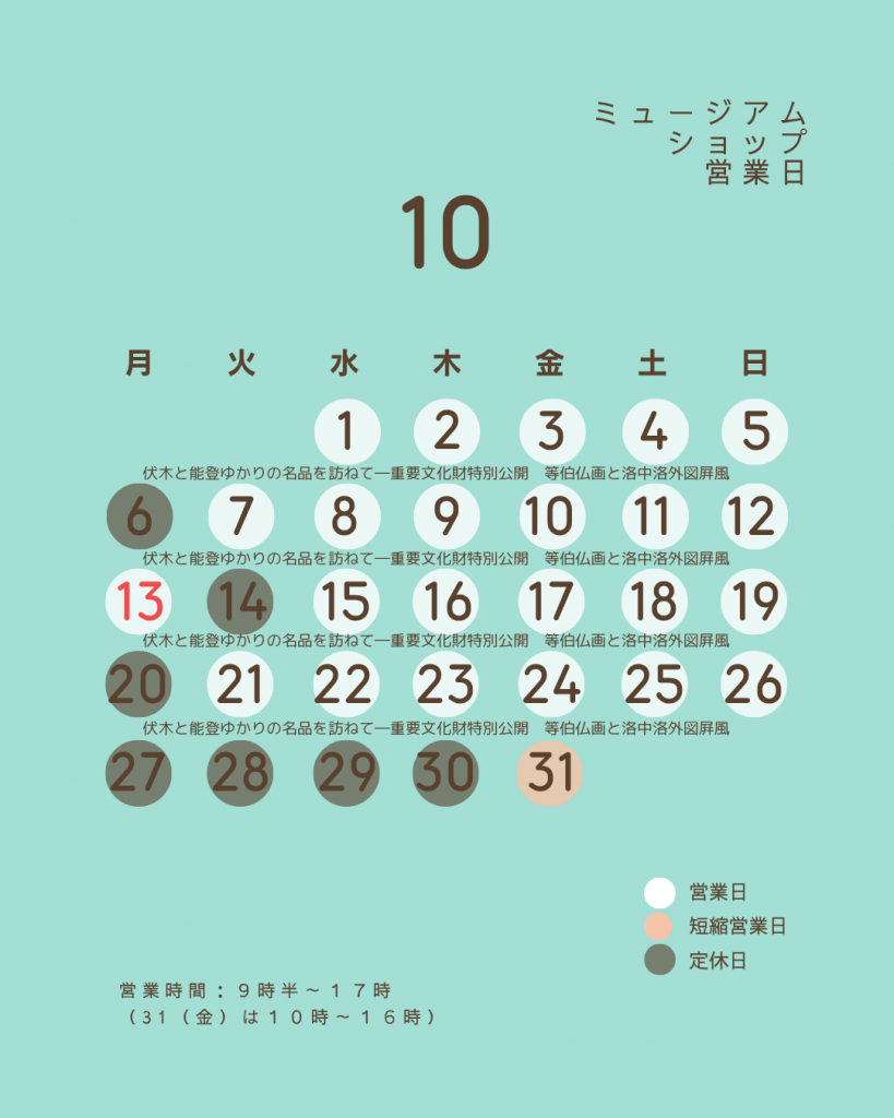 10月のミュージアムショップ営業日は次のとおりです。📅営業日:10/1(水)~26(日)、31(金)📌31(金)は10時~16時の営業です。6(月)、14(火)、20(月)は休館日につき、休みです。営業時間をお確かめの上、お越しくださいませ。