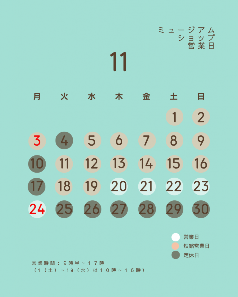 11月のミュージアムショップ営業日は次のとおりです。📅営業日: 11/1(土)~11/24(月・振休)📌11/1(土)~19(水)は10時~16時の営業です。4(火)、10(月)、17(月)は休館日につき、休みです。営業時間をお確かめの上、お越しくださいませ。