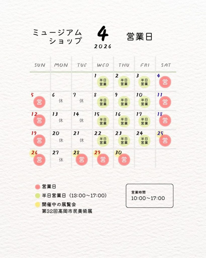 4月のミュージアムショップ営業日は次のとおりです。📅営業日:4/1(水)~5(日)、8(水)~12(日)、15(水)~19(日)、22(水)~26(日)、28(火)~30(木)📌4/1(水)~3(金)、8(水)~10(金)、15(水)~17(金)、22(水)~24(金)は13時~17時の営業となります。